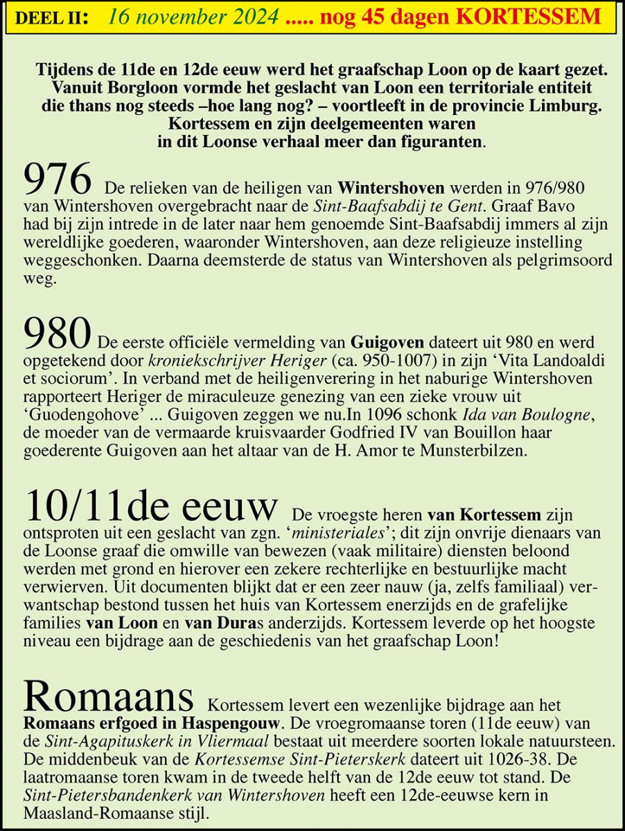 Bij het naderen van het definitief einde van de autonome Haspengouwse gemeente Kortessem vind ik het – vanuit mijn verleden én diepste overtuiging – mijn morele plicht om gebeurtenissen, ontwikkelingen, instellingen en personen die de identiteit van Kortessem door de eeuwen heen bepaalden, op een passende wijze respectvol in herinnering te brengen. Ik doe dit vanuit de geotoeristische invalshoek. Geotoerisme staat voor ‘zien-inzien-ontzien’ en dit is – wat Kortessem betreft – helaas geen automatische applausmachine! Ik richt mij hierbij niet alleen tot de betrokkenen en geïnteresseerden van vandaag maar ook en vooral tot toekomstige generaties die zich vragen stellen over het ‘plotse’ verdwijnen van het autonome Kortessem uit de schitterende caleidoscoop die Haspengouw is. Omwille van de aard en de benadering van het onderwerp valt deze blog wat langer uit dan de overige blogs die ik in mijn reeks ‘Haspengouws Overleeft’ reeds geschreven en gedocumenteerd heb. Ik breng mijn hommage chronologisch in veertien delen, telkens gescheiden door een foto die illustratief is voor de beschreven periode. Als epiloog voeg ik er een nawoord aan toe met enkele persoonlijke meningen, vragen en bekommernissen omtrent de duistere ontknoping van deze story.